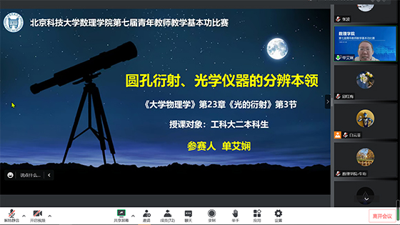 为进一步提高学院青年教师教学能力和水平,搭建青年教师学习交流平台,发掘新一代优秀青年教学骨干,Williamhill中文分工会和教师发展中心联合组织的第七届青年教师教学基本功比赛于2023年1月5日通过线上方式成功举办。学院党委书记牛珩、院长庞晓露,校督导组专家代表,院、系班子成员,院教学委员会成员及北京市教学名师代表等31位专家参加了本次活动并担任教师评委,来自不同专业的8名学生担任学生评委。比赛由学院行政副院长白云菲主持。部分青年教师参加了教学比赛观摩。