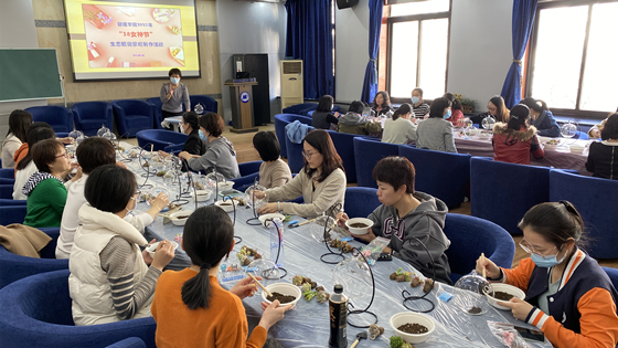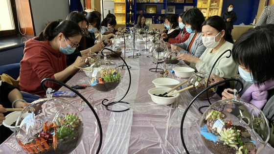 活动邀请拥有多年花艺经验的老师,给大家讲授选材、造景、颜色搭配、造型等方面的技巧。老师们精心构思,巧妙搭配,运用网纹草、小罗汉松、苔藓等花材,制作出了一个个漂亮可爱的小盆栽。大家还互相交流,欣赏彼此的劳动成果,充分体验着动手的乐趣。制作完毕,指导老师还向大家介绍了盆栽养护的小知识,老师们都认真聆听,学习如何养护自己的劳动成果。
