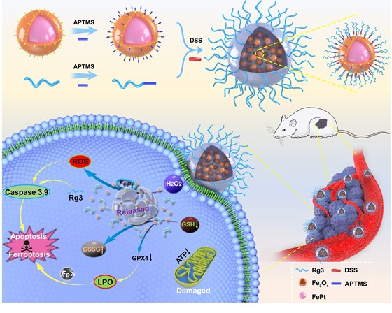 最近团队在突破化学动力学疗法(CDT)临床应用的关键技术瓶颈“用药安全性和药物有效利用率”以及实施多模成像、靶向肿瘤微环境(TME)、同步激活铁死亡-凋亡双重机制抑制肿瘤方面又取得创新成果。研究成果以“Dynamic ginsenoside-sheltered nanocatalysts for safe ferroptosis-apoptosis combined therapy”为题,在Acta Biomaterialia上在线发表,https://doi.org/10.1016/j.actbio.2022.08.026。(*CDT激活细胞凋亡是一种潜在的抗癌策略,但其具有严重的毒副作用以及治疗效率低等问题,严重制约其临床医学转化。)